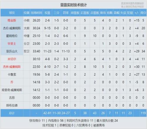 第四节中段,凯尔登连得5分,马刺一度追到12分。卡鲁索连得5分回应,雷霆再次拉开。文班第三节得到4分,第四节仅得3分。全场结束,雷霆119-98大胜马刺21分。亚历山大34分5板5助4帽、杰威20分3助2断!雷霆盖帽数11-3!