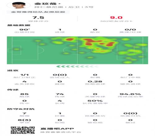 体育播报1月15日宣 德甲第17轮,拜仁3-1战胜科隆。金玟哉首发出战,贡献1粒进球,还有7次解围和1次拦截,传球成功率94.6%,评分7.5。