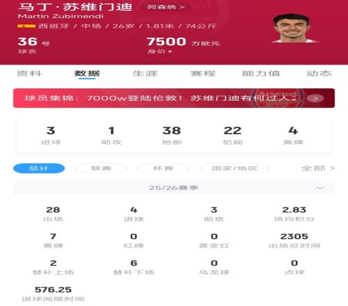加盟阿森纳后,苏维门迪本赛季出战28场比赛贡献4球3助,出场时间2305分钟全队第二,仅次于门将拉亚。目前26岁的苏维门迪德转身价也从加盟时的6000万欧元,上涨到了7500万欧元。