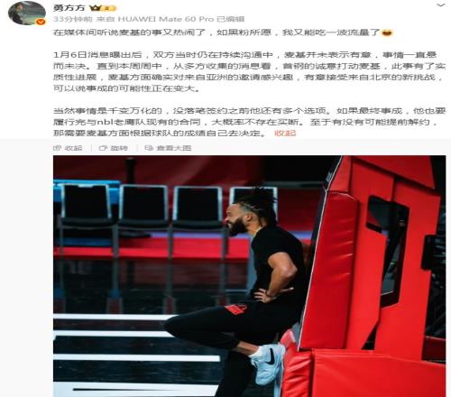 勇方方写道:“1月6日消息曝出后,双方当时仍在持续沟通中,麦基并未表示有意,事情一直悬而未决。直到本周周中,从多方收集的消息看,首钢的诚意打动麦基,此事有了实质性进展,麦基方面确实对来自亚洲的邀请感兴趣,有意接受来自北京的新挑战,可以说事成的可能性正在变大。”