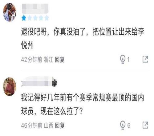 本轮浙江被史密斯绝杀,以2分不敌深圳的比赛,吴前可以说是球队输球的罪魁祸首,但凡他能多命中一个三分球,都不至于让球队功亏一篑。全场比赛打下来,吴前在27分钟的上场时间里,6中1,三分球4中1,拿到5分5助攻,-7的正负值为全队最差。他的低迷,也引起了球迷的热议:“退役吧,你真没油了,把位置让给李悦洲吧”、“开始向范子铭看齐了”。