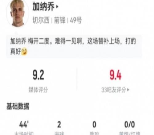加纳乔本场替补2射进2球3过人3成功+6对抗4成功获评9.2分